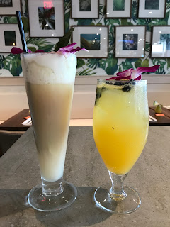 I was invited to go check it out. Excited! I went on a Saturday for lunch with a friend. The last time I had seen the space, it was still under construction. Now it's got the retail store, with the restaurant, with a HUGE covered patio next to it. And it was a beautiful day. We opted to sit inside because there were less people. The inside decor was very tropical. It felt like you were at a resort, on vacation, and I liked that very much.